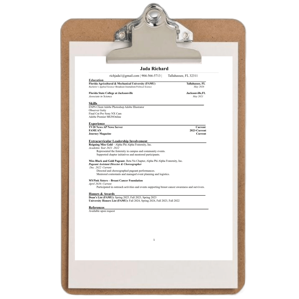 Meet Jada Richard, a Broadcast Journalist and Political Science student at Florida Agricultural & Mechanical University (FAMU), with a strong background in multimedia storytelling, news production, and visual media. She has hands-on experience working with platforms such as ENPS, Adobe Premiere, Final Cut Pro, and the Sony NX Cam, along with contributions to TV20 News, AP News Server, and FAMUAN. Jada combines technical skills with leadership experience, having served in roles that emphasize creativity, organization, and community engagement. Her work reflects a passion for impactful storytelling, media production, and elevating diverse voices through journalism and creative expression.